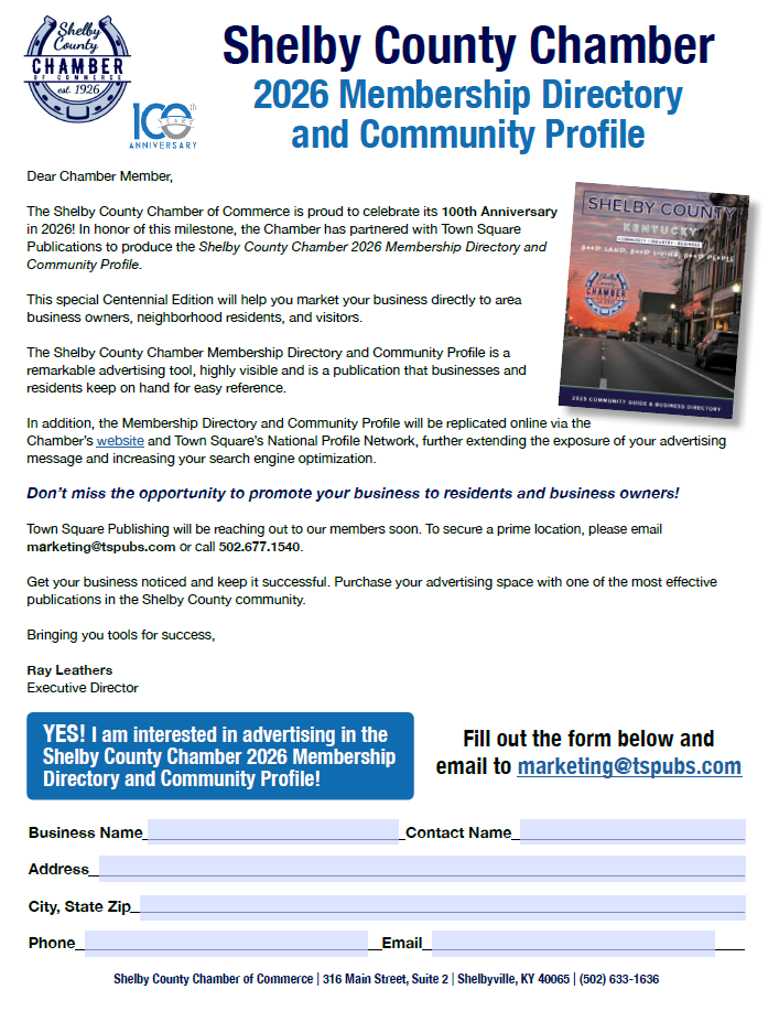 It is that time of the year to secure YOUR spot in the CENTENNIAL EDITION of your Shelby County Chamber of Commerce Member Directory and Community Guide! Trust me, you do not want to miss this opportunity!